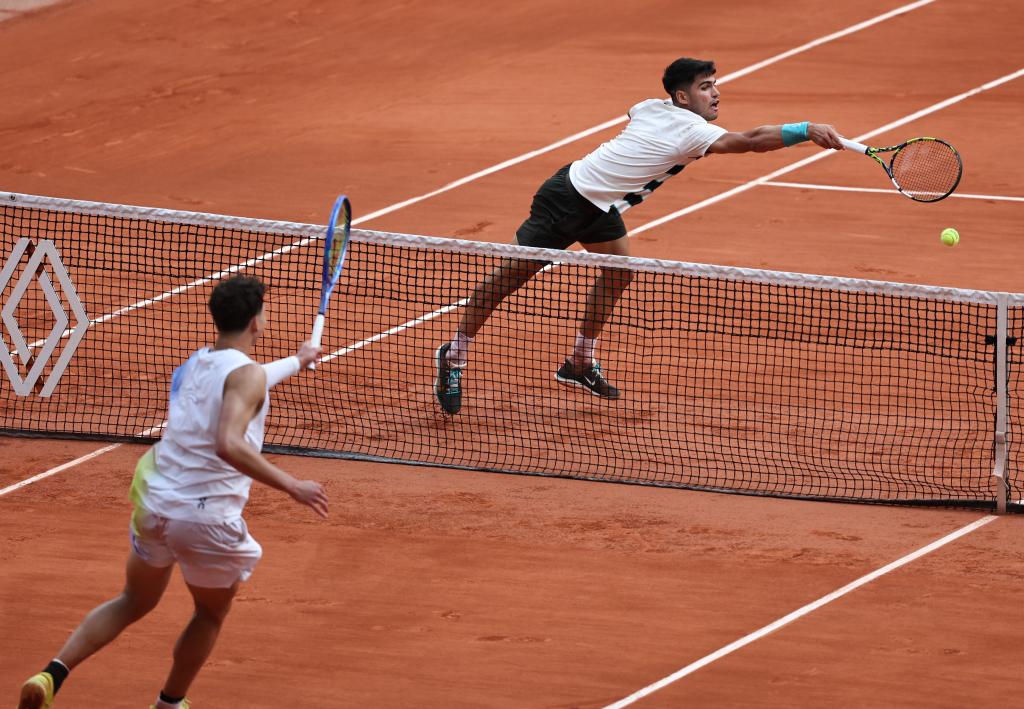 6月1日,阿爾卡拉斯(右)和謝爾頓在比賽中。新華社記者 李京 攝