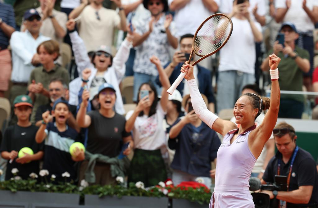 鄭欽文經過一場2小時47分鐘的苦戰,以7:6(5)、1:6、6:3擊敗俄羅斯選手薩姆索諾娃,職業生涯首次闖進法網女單八強,第四次打進大滿貫女單八強。