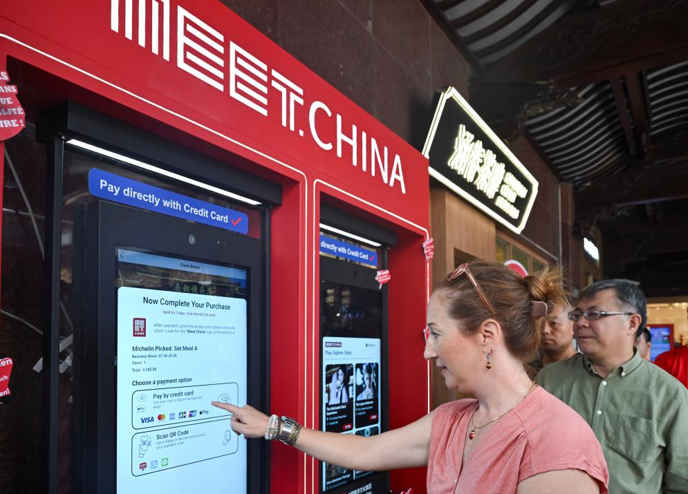 2025年9月27日,外籍嘉賓在上海豫園體驗使用“Meet China”入境旅游數字消費大屏。新華社記者 陳浩明 攝