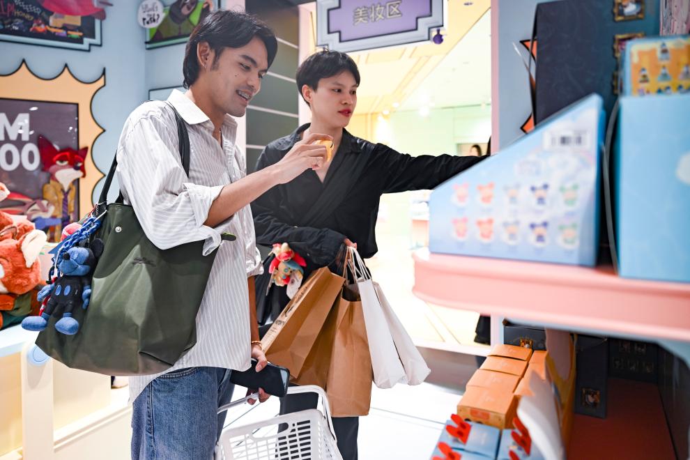 2025年7月17日,兩名泰國游客在位於上海市南京路步行街的一家潮玩店裏挑選商品。新華社記者 陳浩明 攝