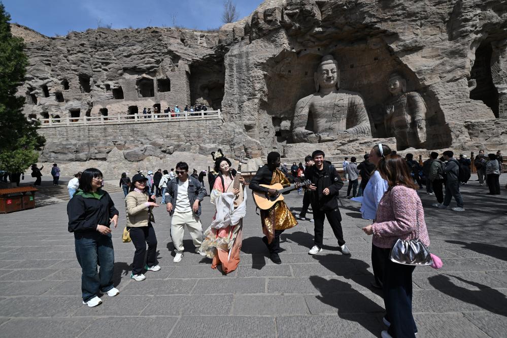 2025年4月15日,在雲岡石窟,身着傳統服裝的演員和游客互動。新華社記者 詹彥 攝