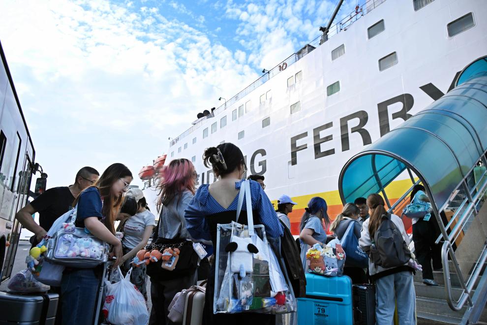 2025年10月1日,在青島郵輪母港碼頭,旅客登上客貨班輪“新金橋5號”。新華社記者 李紫恒 攝