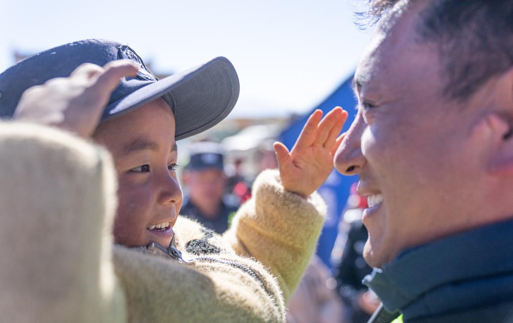 在定日縣長所鄉嘎布村,一名小朋友戴上移民警察米瑪次仁的帽子敬禮(2025年1月14日攝)。新華社記者 丁增尼達 攝