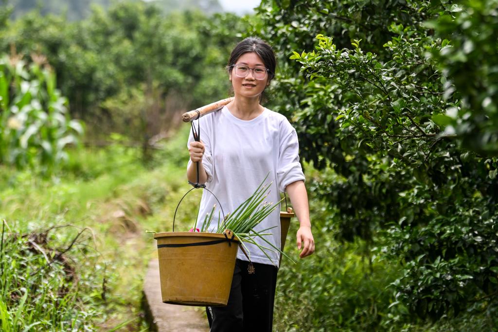 在廣西桂林市灌陽縣新街鎮,劉燕用扁擔挑着在自家菜地採摘的蔬菜走在回家路上(2025年6月13日攝)。新華社記者 曹祎銘 攝