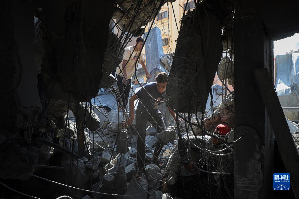 11月3日,在加沙地帶南部城市汗尤尼斯,人們在遭襲擊後的建築廢墟上實施救援。