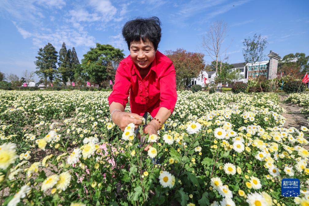 11月4日,三村村村民許巧芬在杭白菊基地裏採摘杭白菊。