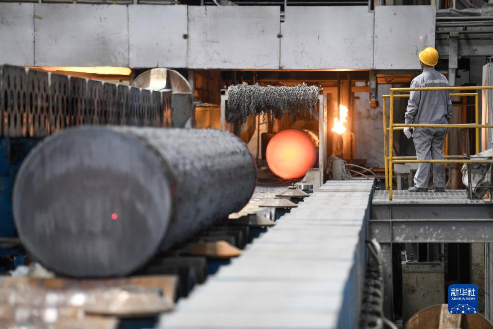 11月4日,在承德市營子區一家特殊鋼生産企業,工人查看切割後圓坯斷面情況。