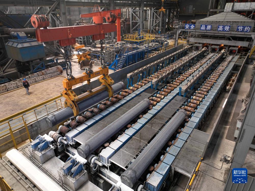 11月4日,在承德市營子區一家特殊鋼生産企業,工人利用天車吊裝連鑄圓坯(無人機照片)。