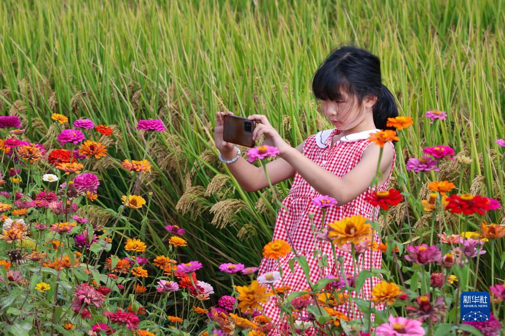 11月4日,在浙江省余姚市三七市鎮魏家橋村,小朋友在稻田邊拍照。