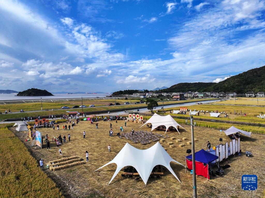 11月4日,在浙江省舟山市定海區鹽倉街道新螺頭村,人們在百畝稻田游玩(無人機照片)。