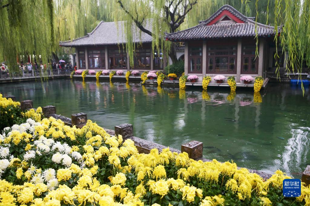 11月5日,在山東省濟南市趵突泉公園,游客在趵突泉金秋菊展上參觀。