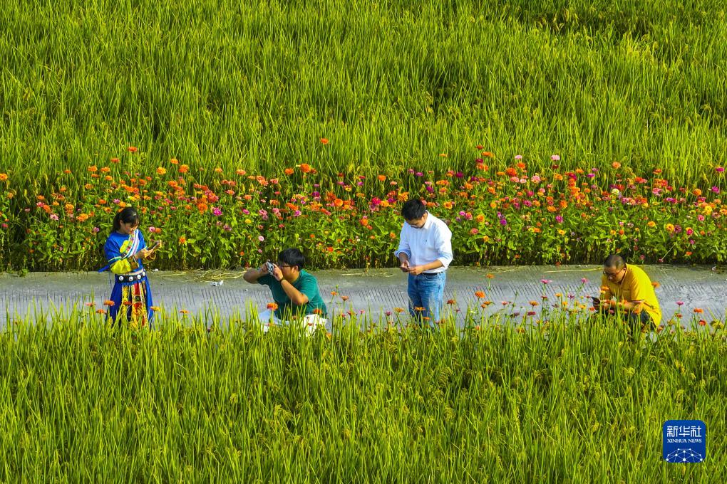 11月4日,在浙江省余姚市三七市鎮魏家橋村,游客在稻田邊游玩拍照(無人機照片)。