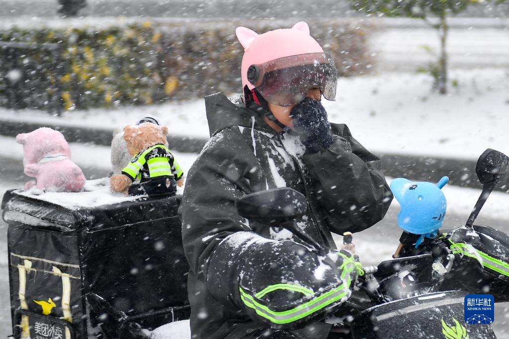 11月6日,在長春市街頭,一名外賣員在雪中騎行。