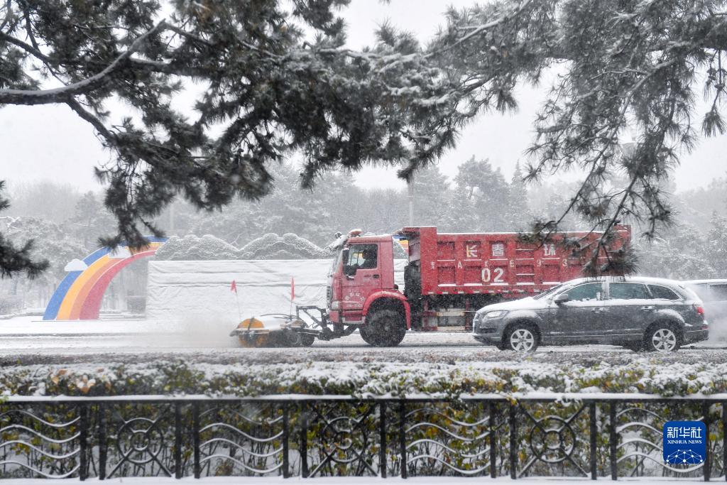 11月6日,清雪車輛在長春市街頭進行清雪作業。