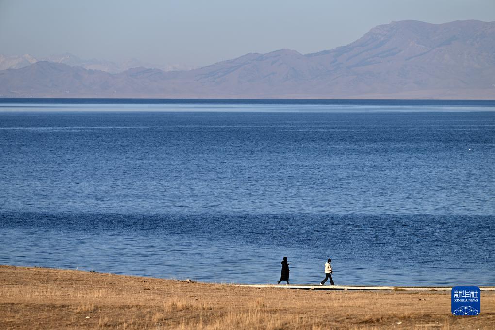 11月6日,游客在新疆賽裏木湖邊游玩。