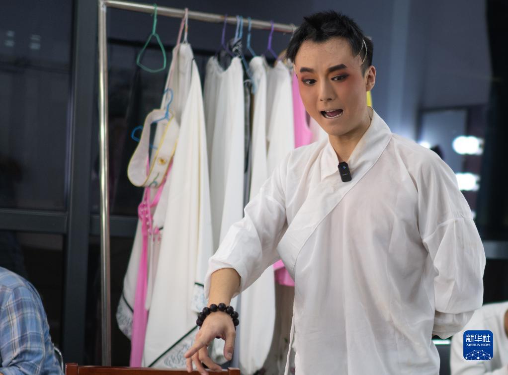 10月28日,黃梅戲演員李洋在化粧間開嗓練聲。