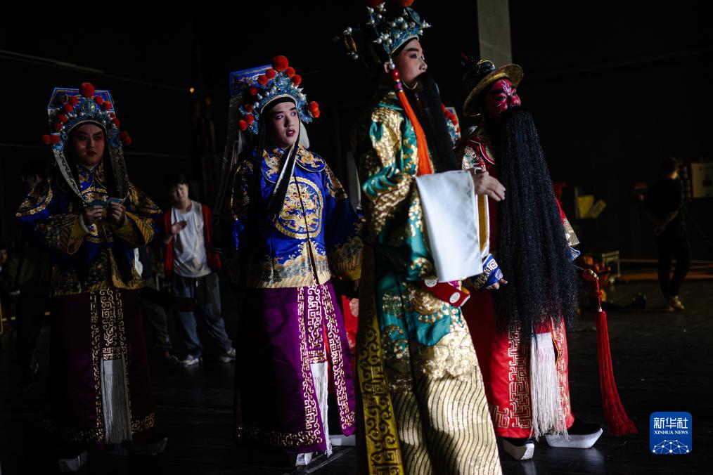 10月28日,楚劇演員艾子竣、張子涵、王超 、何汶傑(從右至左)在&邊候場,等待出演《秦琼表功》。