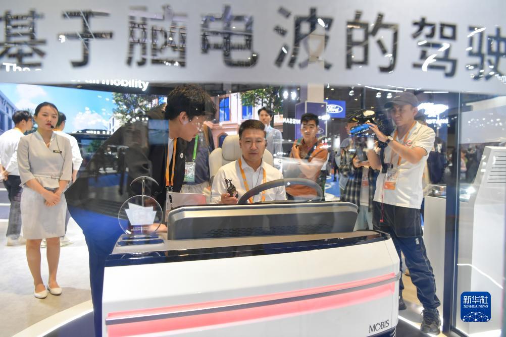11月6日,參觀者在第六屆進博會汽車展區摩比斯展&體驗基於腦電波的駕駛員狀態監測系統M.Brain2.0。