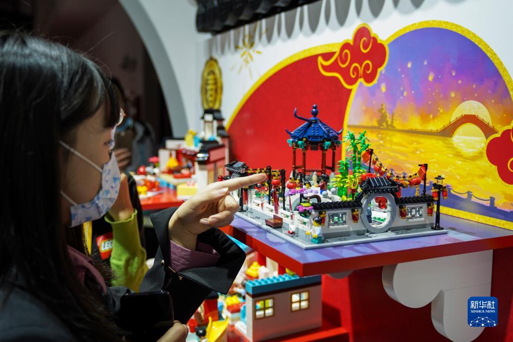 2020年11月8日,觀眾在第三屆進博會消費品展區樂高展&參觀用樂高積木搭建的中國風庭院。