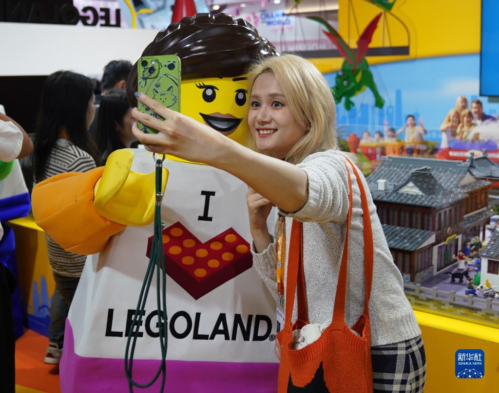 11月7日,在第六屆進博會消費品展區樂高集團展&,參觀者與樂高人偶合影。