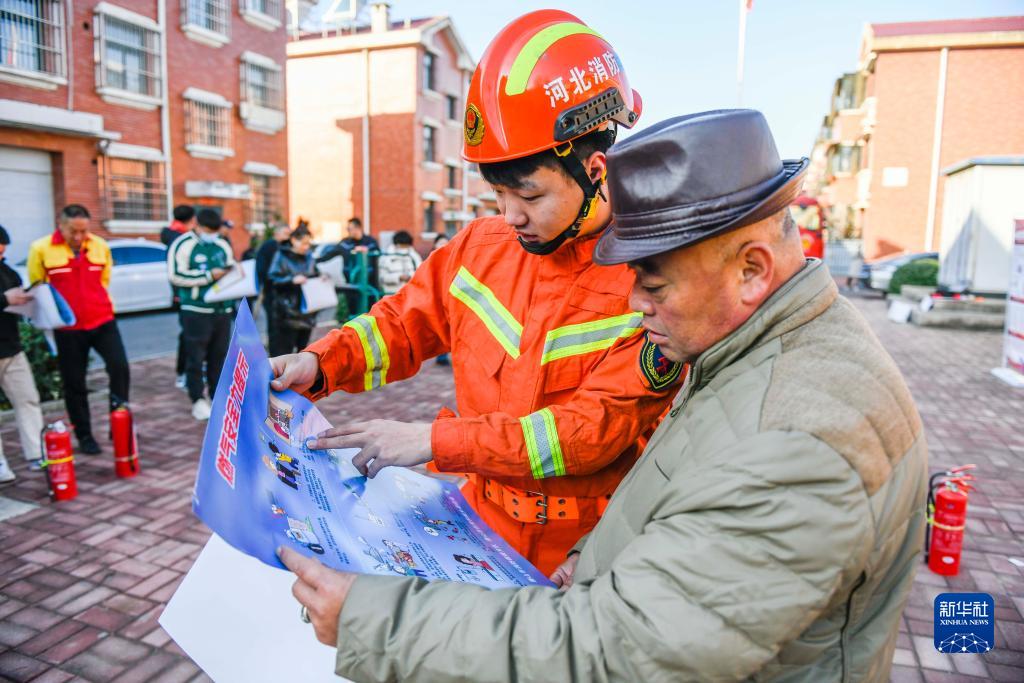 11月8日,在河北省遵化市西三里鎮一社區,消防救援人員向村民普及消防知識。