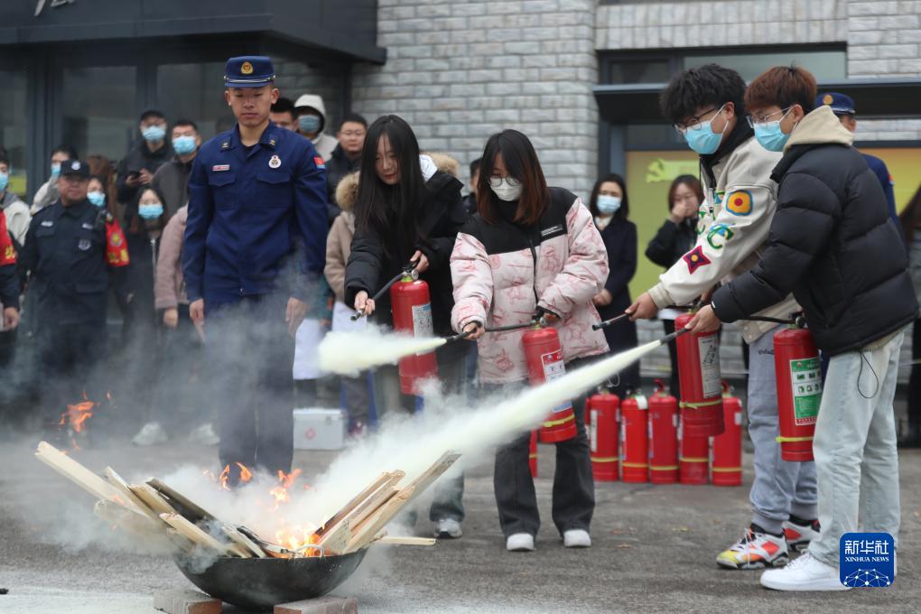 11月8日,瀋陽工學院學生演練使用滅火器。