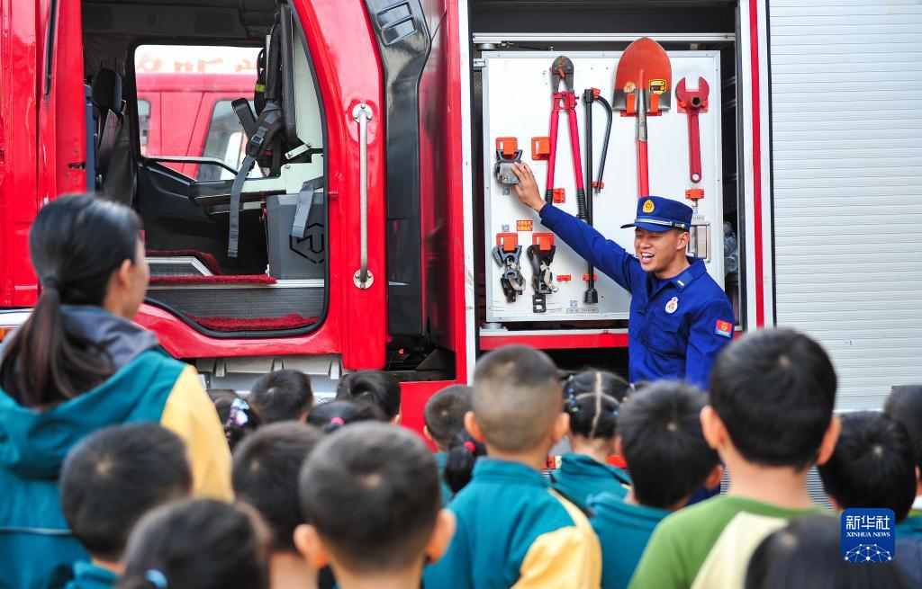 11月8日,在貴州省黔東南苗族侗族自治州從江縣消防救援大隊,消防救援人員給小朋友普及消防知識。