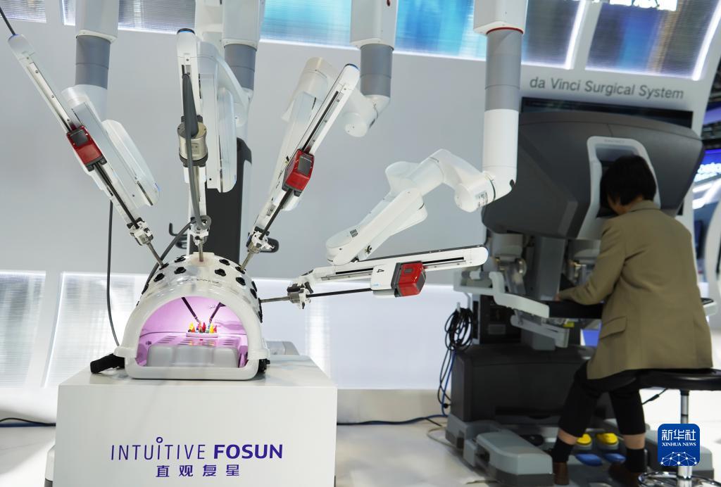 11月7日,在第六屆進博會醫療器械及醫藥保健展區復星健康展&,工作人員演示操作國産達芬奇手術機器人。