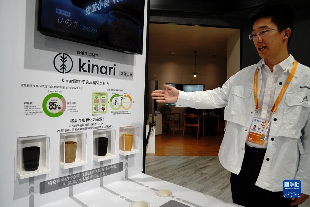 11月9日,在消費品展區松下展&,工作人員介紹利用植物廢棄物轉化的纖維生態材料。