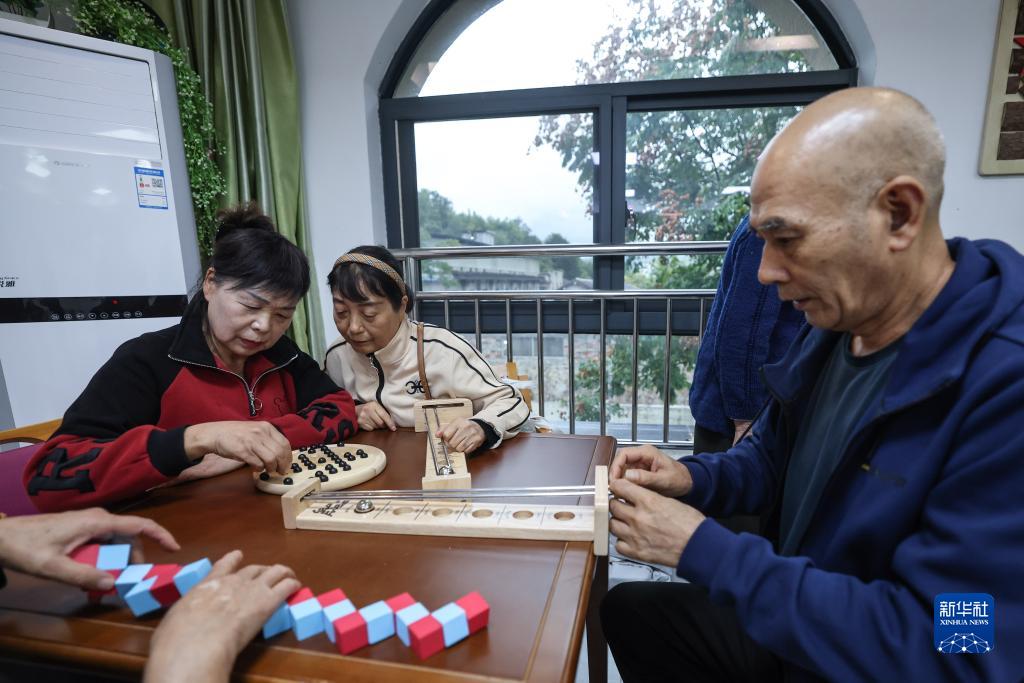 11月10日,在雲和縣百齡幫鳳凰家園長者養護中心的老年木玩活動室內,老人們在玩益智木玩。雲和縣民政部門積極在多個養老中心推進木玩活動室的建設,活動室以益智類、運動類、康復類、康養類等木制玩具為媒介,幫助老年人動手動腦,保持大腦健康活力。