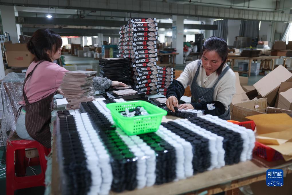 11月10日,在浙江金馬工藝品有限公司的車間內,工作人員在生産老年益智木玩産品。