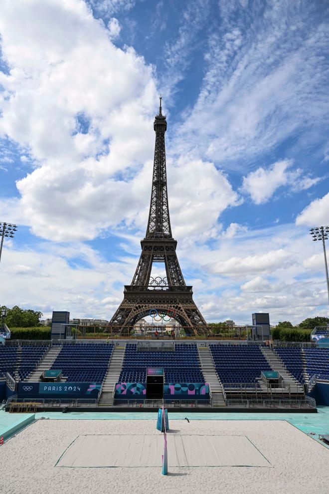 ↑7月10日從巴黎奧運會沙灘排球賽場內拍攝的埃菲爾鐵塔。新華社記者 賀長山 攝