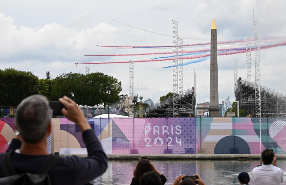 ↑7月14日,觀眾在巴黎協和廣場觀看法國國慶閱兵式的飛行表演。新華社記者 賀長山 攝