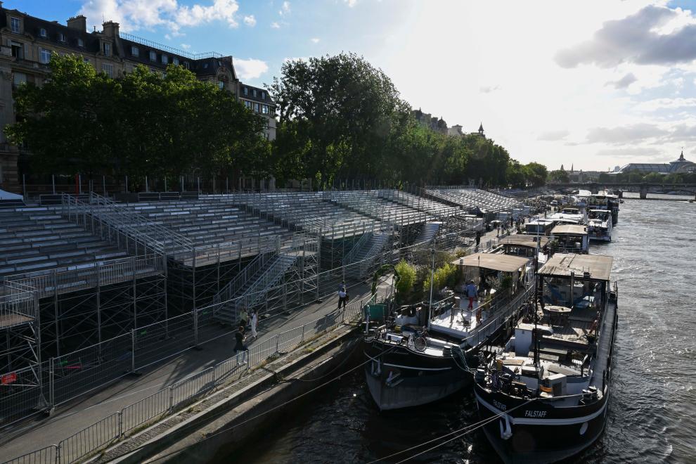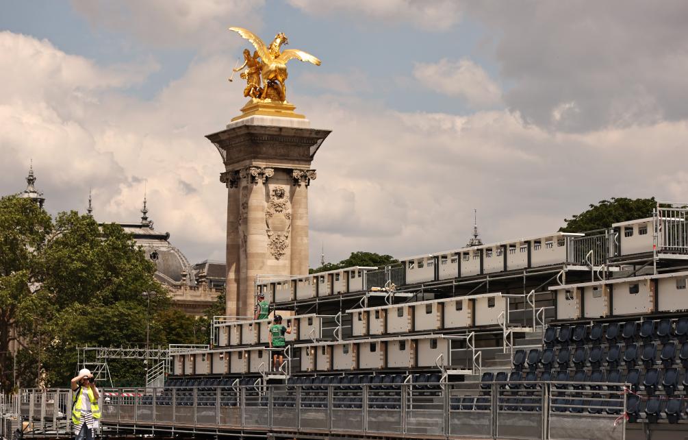 ↑6月4日在位於法國巴黎市中心的亞歷山大三世橋拍攝的臨時比賽場地搭建現場。新華社記者 高靜 攝