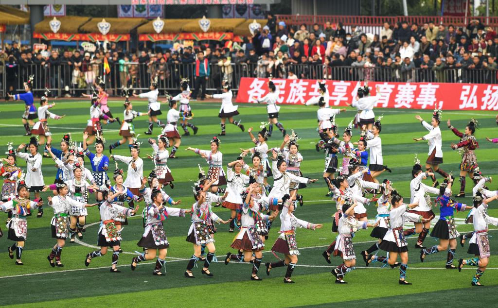 1月4日,榕江三中的學生在揭幕戰半場時間表演舞蹈《侗家姑娘》。新華社記者 楊文斌 攝