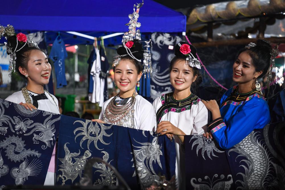 2023年6月30日,村民在貴州“村超”足球賽場旁的文創攤位展示民族服飾。新華社記者 楊文斌 攝