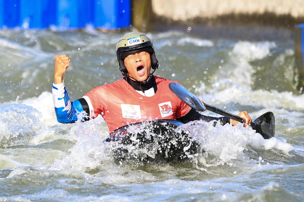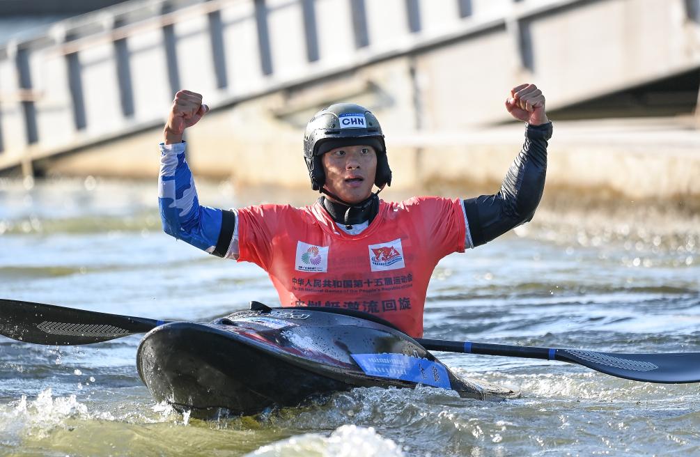 11月15日,福建隊選手全鑫在賽後慶祝勝利。當日,第十五屆全國運動會皮划艇激流迴旋項目男子極限皮艇決賽在廣州舉行。新華社記者 唐奕 攝
