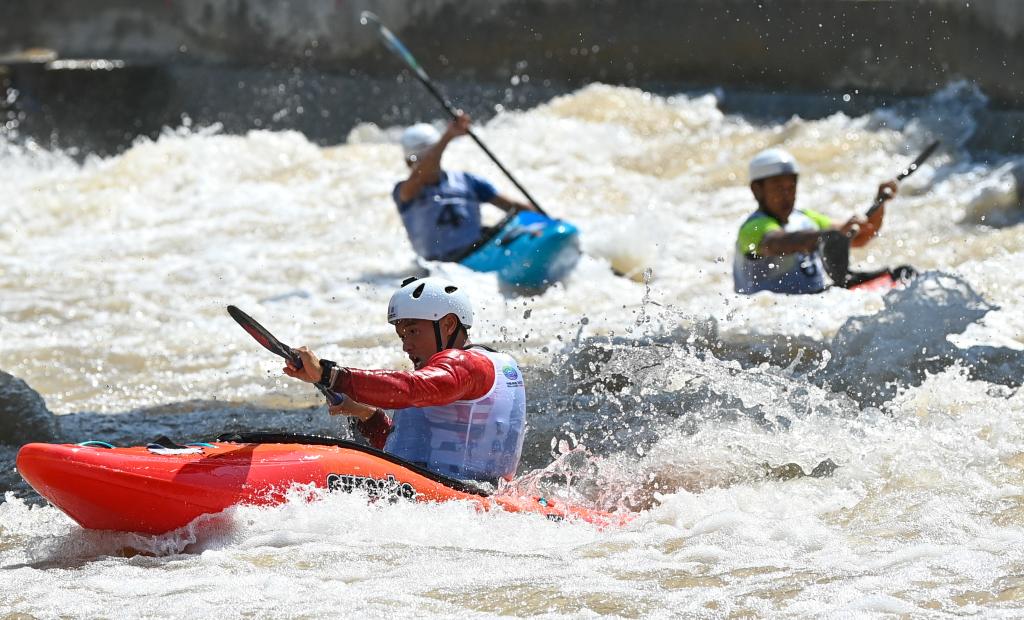 2023年10月7日,中國選手全鑫在比賽中。當日,杭州亞運會皮划艇激流迴旋項目男子單人皮艇決賽在杭州富陽水上運動中心舉行。新華社記者 杜瀟逸 攝