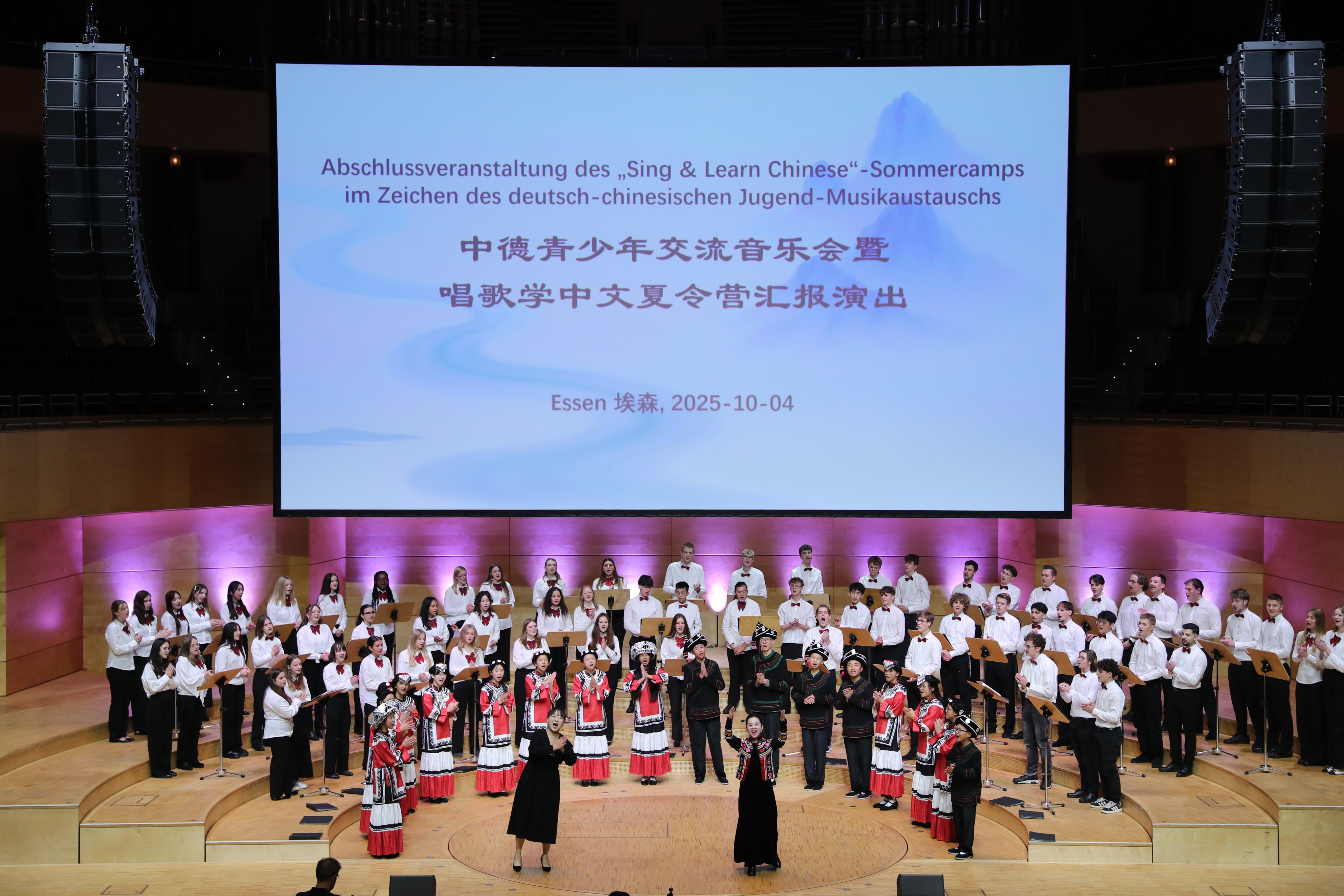 新華社德國埃森10月5日電(記者杜哲宇)中德青少年交流音樂會暨“唱歌學中文”夏令營匯報演出4日在德國埃森市舉行。來自德國伯樂中文合唱團、雲南大學及其附屬中學的師生攜手登&,用音樂傳遞友誼,交流多元文化,共同表達對未來的美好期待。