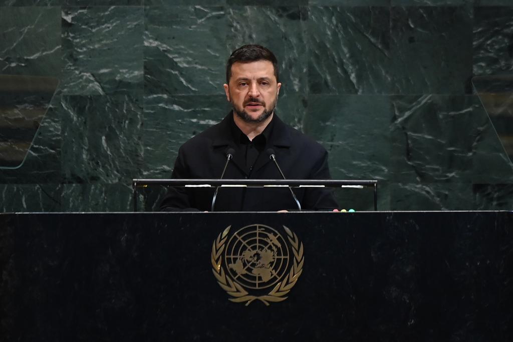 9月24日,在位於紐約的聯合國總部,烏克蘭總統澤連斯基在第80屆聯合國大會一般性辯論上發言。新華社記者李睿攝