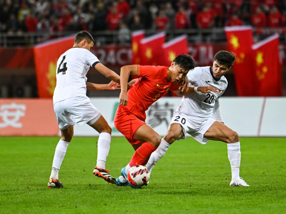 2024年11月19日,在四川成都舉行的2024CFA中國之隊·熊貓杯國際足球錦標賽中,中國隊球員杜月徵(中)在比賽中進攻。新華社記者 王曦 攝