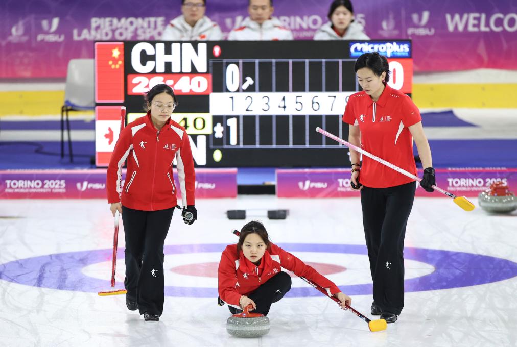 同樣在塔佐利冰上運動中心進行的還有冰壺比賽,由北京體育大學學生尹子怡、渠偌萱、譚斯婷、裴君杭、葉紫萱組成的中國女隊,先是在白天的比賽中以4:6不敵日本隊,隨後又在晚間的最後一輪循環賽中以3:6不敵加拿大隊,最終以5勝4負的成績排名循環賽第五,無緣四強。