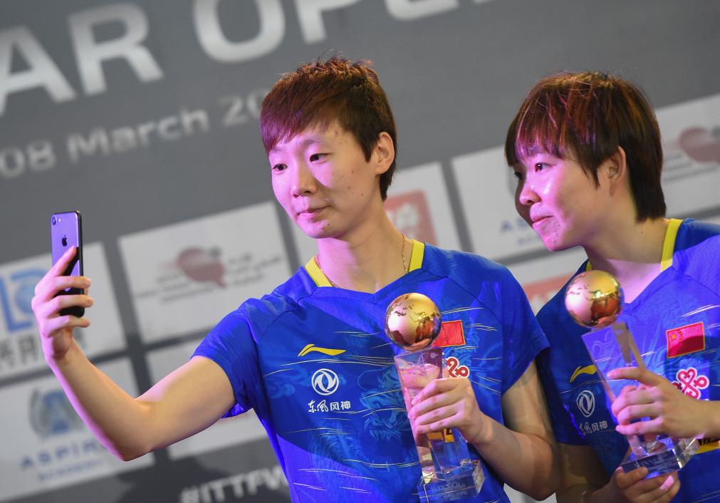 2020年3月7日,在2020年國際乒聯世界巡迴賽卡塔爾公開賽女雙決賽中,中國組合王曼昱(左)/朱雨玲以3比1戰勝日本組合長崎美柚/木原美悠,奪得冠軍。圖為王曼昱/朱雨玲在頒獎&上自拍。新華社發(尼庫攝)