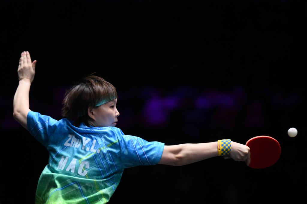 2024年9月9日,在澳門舉行的2024年世界乒乓球職業大聯盟(WTT)澳門冠軍賽女子單打首輪比賽中,中國澳門選手朱雨玲3比0戰勝波蘭選手巴約,晉級下一輪。圖為朱雨玲在比賽中回球。新華社記者 張金加 攝