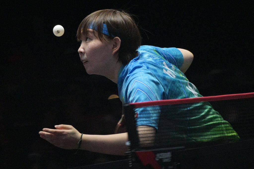 2025年2月7日,在世界乒乓球職業大聯盟(WTT)新加坡大滿貫女單四分之一決賽中,中國選手蒯曼4比1戰勝中國澳門選手朱雨玲,晉級半決賽。圖為朱雨玲在比賽中發球。新華社發(鄧智煒攝)