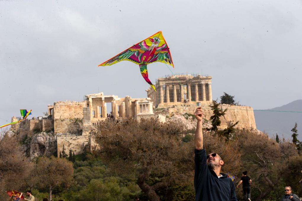 2023年2月27日,一名男子在希臘雅典衛城附近放風箏。新華社發(馬裏奧斯·羅洛斯攝)
